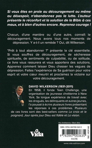 “Prêt à tout abandonner ?” présente la clé essentielle. Si vous souffrez de découragement, de sécheresse spirituelle, de sentiments de culpabilité, ou de solitude, ce livre vous rassurera et vous apportera des solutions. Apprenez comment laisser Dieu chasser les vagues de dépression. Faites l’expérience de Sa guérison pour votre esprit et votre coeur meurtri et proclamez la victoire sur votre découragement.